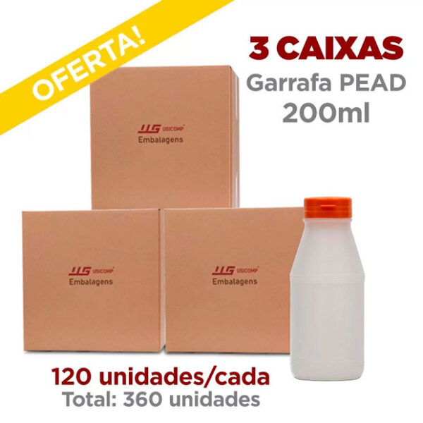 R$204,82 no pix R$215,60 Em até 3x de R$71,87 sem jurosCombo 3 Caixas Garrafa PEAD 200ml Redonda com Tampa Pressão