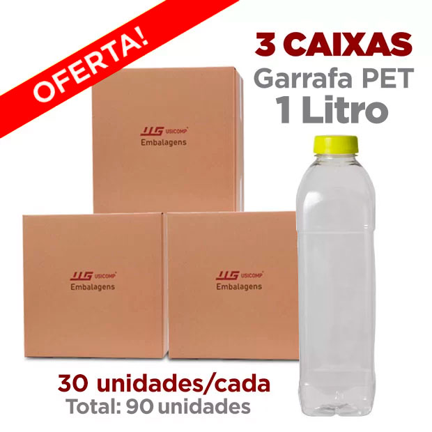 Início Combo 3 caixas Combo 3 Caixas Garrafa Pet 1000ml Quadrada Família com Tampa Rosca C/ 90 Un. Cada caixa com 30 Un.